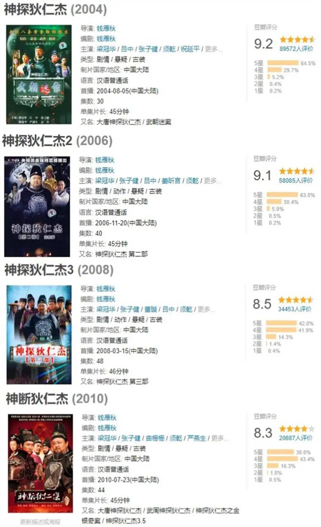《神探狄仁杰》系列是古装悬疑探案剧的经典之作,每一部都保持了高水准,尤其是第二部整体好评竟然超过了第一部,前两部豆瓣评分都超过了9分,第三部和第四部豆瓣评分也在8分以上。
