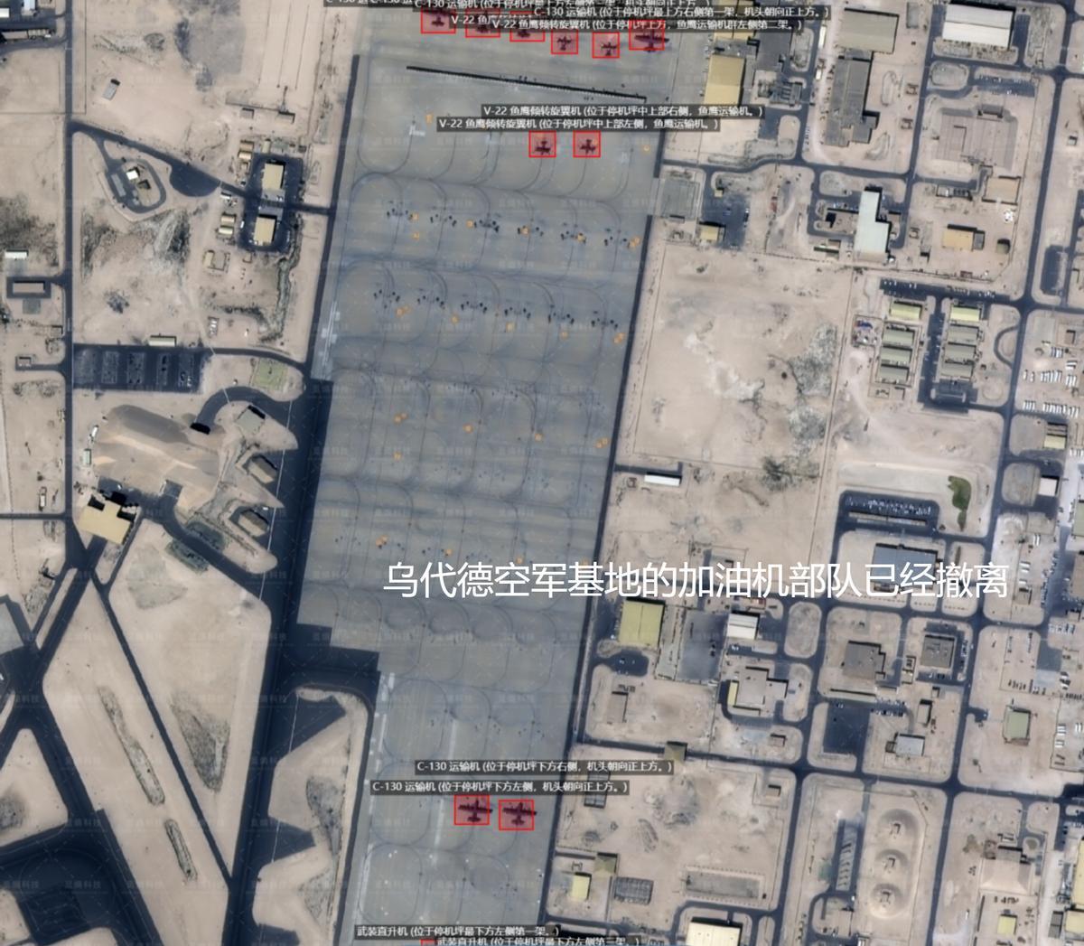 美军在中东最大空军基地乌代德空军基地的新卫星图则显示,原本部署在此地的KC-135等加油机已经全部撤出,机场上只剩下几架运输机和直升机,明显是在防备伊朗对机场进行打击而提前撤出了一定的力量。
