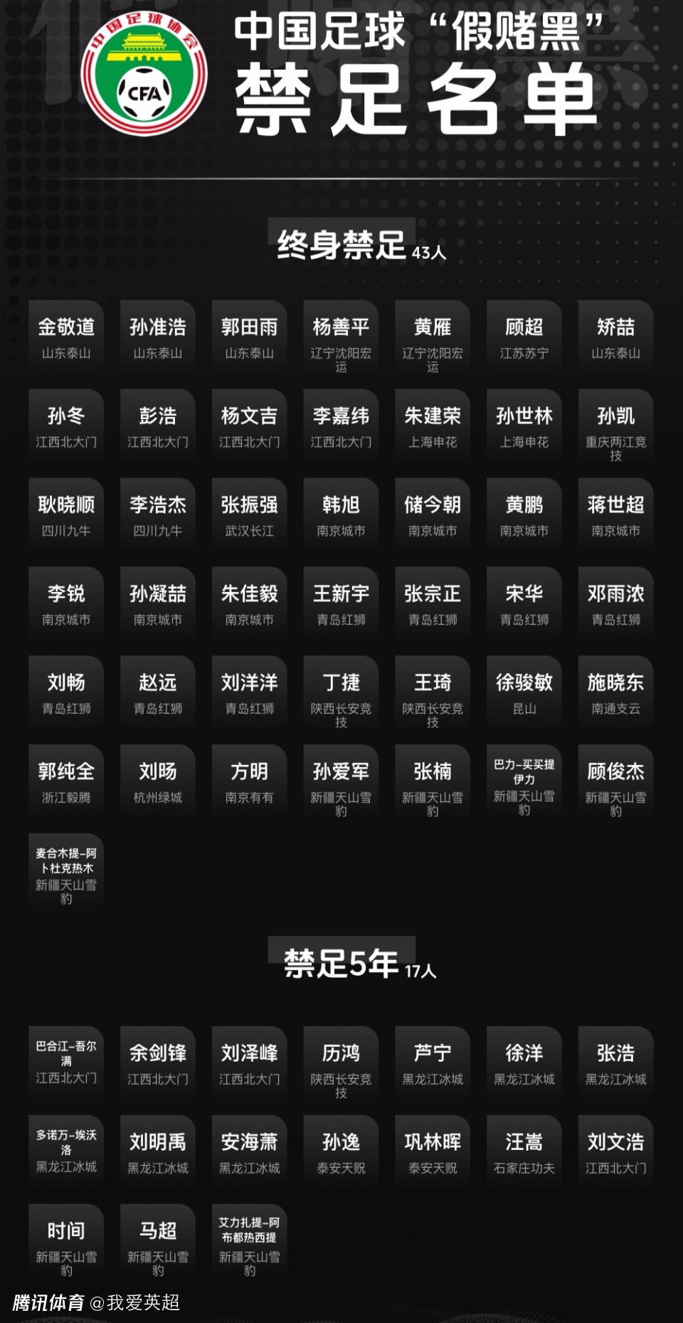 2024年9月10日,中国足协公布首批涉案人员的行业处罚,多达60人被罚,金敬道、孙准浩、郭田雨,顾超等多位中超名将在内的43人被终身禁足,老将汪嵩等17人禁足5年。