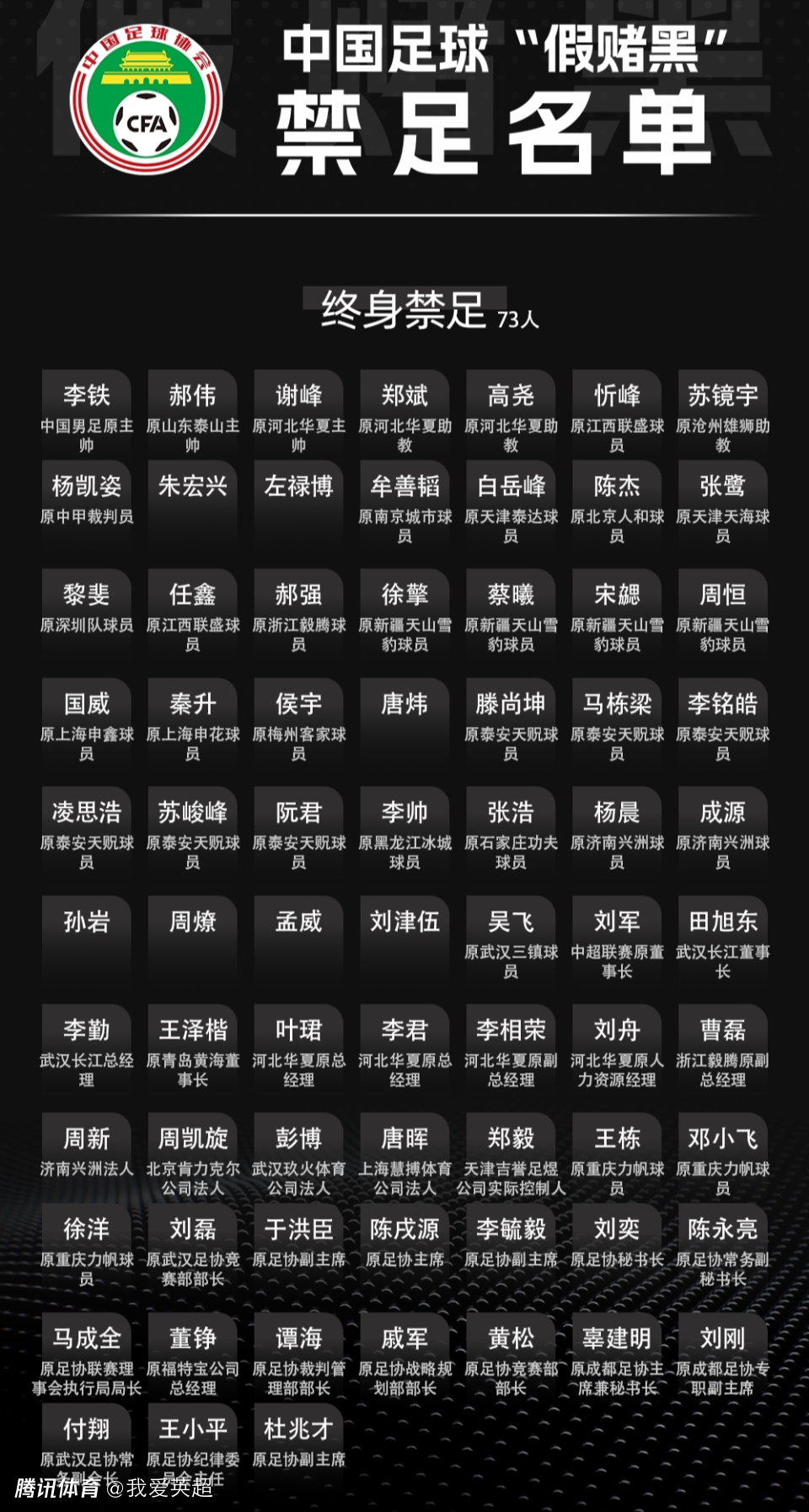 今年1月29日,足协又公布了第2批涉案人员的处罚,76人被罚,陈戌源、杜兆才、李铁、王小平、郝伟、张鹭、秦升等73人终身禁足。