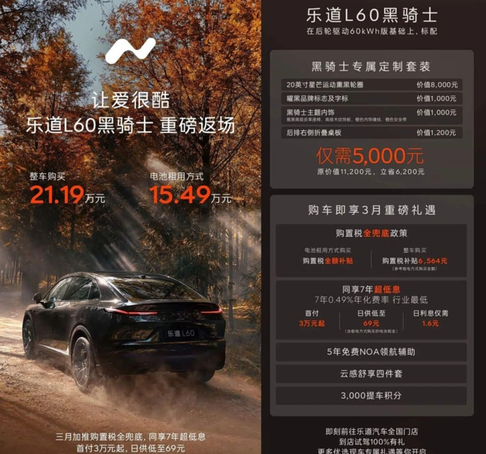 乐道L60黑骑士版正式不限量上市,电池租用价仅15.49万,整车购买21.19万,3月中下旬交付,叠加购置税全兜底与7年超低息,首付3万起、日供69元,以纯电后驱中型SUV的定位,精准对标小米YU7,主打极致性价比与冬季抗冻实力。